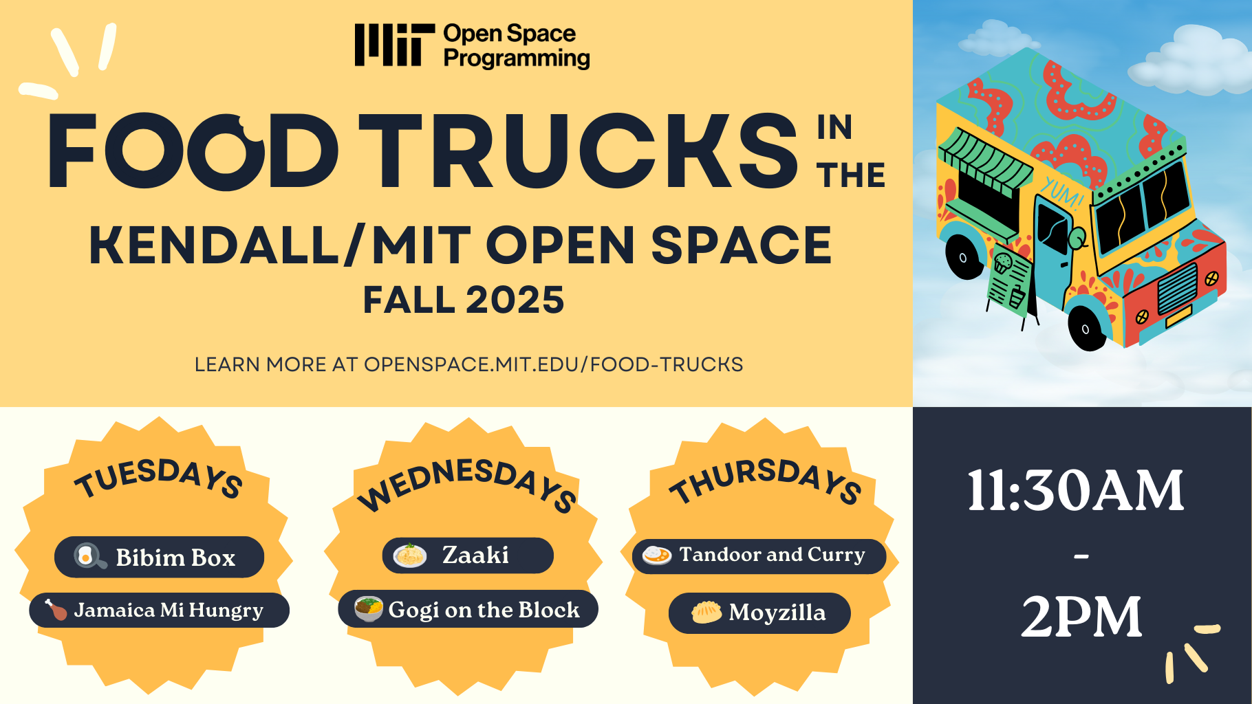 Enjoy a selection of local food trucks every Tuesday through Thursday in the Kendall/MIT Open Space, with plenty of outdoor seating options available!