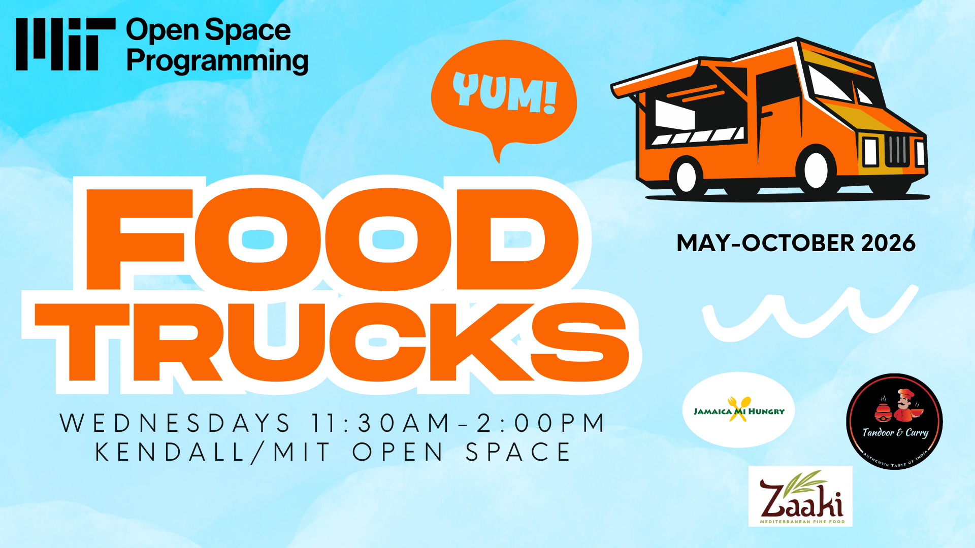 Enjoy a selection of local food trucks every Wednesday in the Kendall/MIT Open Space, with plenty of outdoor seating options available!