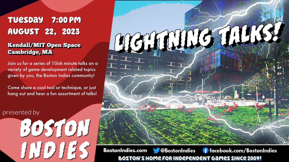Boston Indies is hosting Lightning Talks! ⚡ A series of 10-minute talks on a variety of game development topics given by community members.